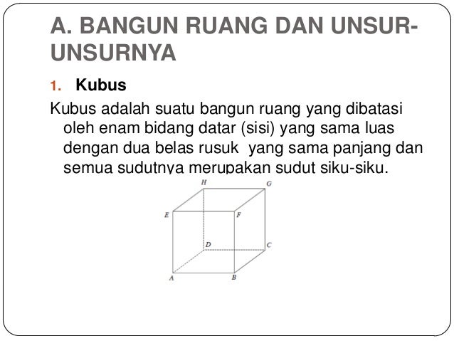 A BANGUN RUANG DAN UNSUR UNSURNYA 1 Pendahuluan Ilmuwan matematika menyebut bangun ruang dengan istilah polihedron yang terdiri atas kata poly banyak dan hedron bentuk Hal ini dikarenakan bangun bangun ruang mempunyai sisi yang seluruhnya berupa bangun beraturan